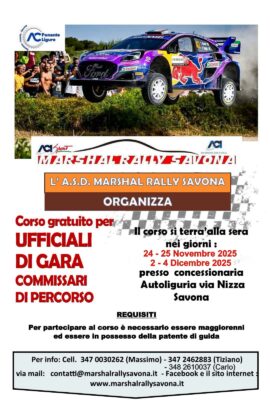Alla fine del 2014 un gruppo numeroso di appassionati che aderivano a gare automobilistiche, decisero in una riunione di far rinascere una nuova associazione con la volontà di tutti. Erano quegli appassionati che avrebbero dato vita al Marshal Rally Savona, in seguito riconosciuto nell’ambito della federazione Aci. Se inizialmente gli Ufficiali di Gara (oppure Marshal) erano solo appassionati disponibili, la loro passione diventò legalizzata. Il nostro gruppo oggi conta oltre 40 persone e la figura predominante e certamente la più simbolica è quella di Commissario di Percorso.Il nostro piccolo contributo